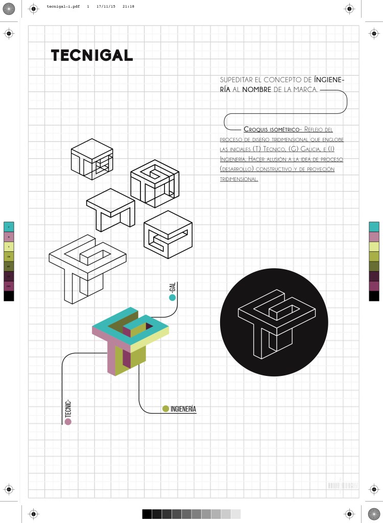 Conceptualización de la identidad basada en la idea de realizar un croquis isométrico, como reflejo del proceso de diseño, incluyendo las iniciales: T de técnico, G de galicia e I de Ingienería.